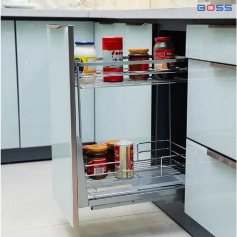Không thể không nhắc đến hệ thống ray âm giảm chấn – một tính năng quan trọng giúp giá gia vị vận hành một cách mượt mà, êm ái. Với cơ chế giảm chấn, sản phẩm không gây tiếng ồn lớn khi đóng mở và tránh được những va đập mạnh có thể làm đổ các lọ gia vị. Điều này mang lại sự thoải mái và tiện lợi tối đa trong quá trình sử dụng, đặc biệt là khi bạn cần thao tác nhanh chóng trong không gian bếp.